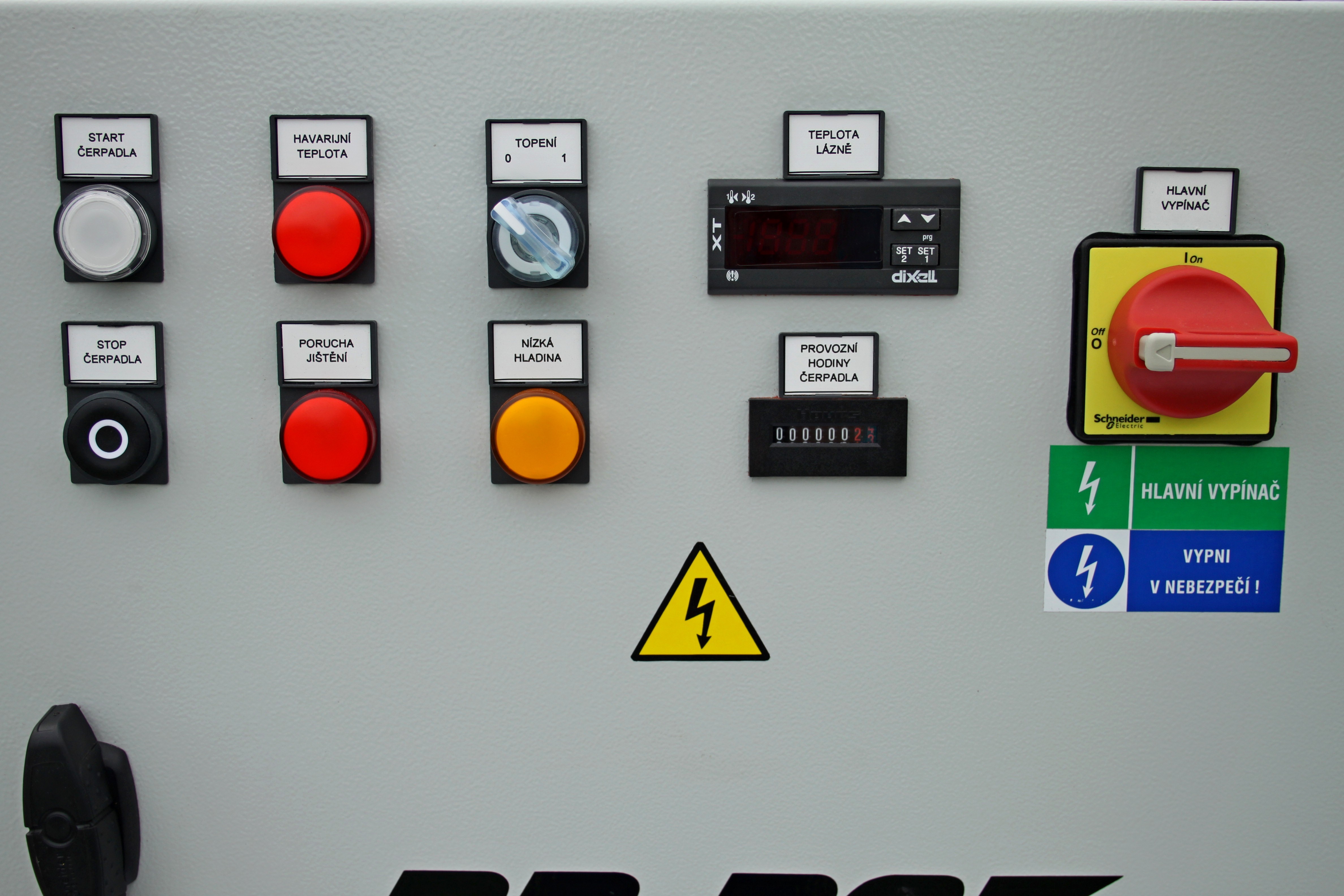 Elektrický rozvaděč je umístěn za nádrží ohřevu. Na rozvaděči jsou všechny ovladače (hlavní vypínač, start a stop čerpadla, dvoustupňový digitální regulátor teploty, čítač provozních hodin, kontrolky havarijních stavů, otočný ovladač topení).