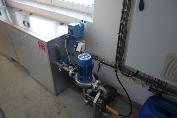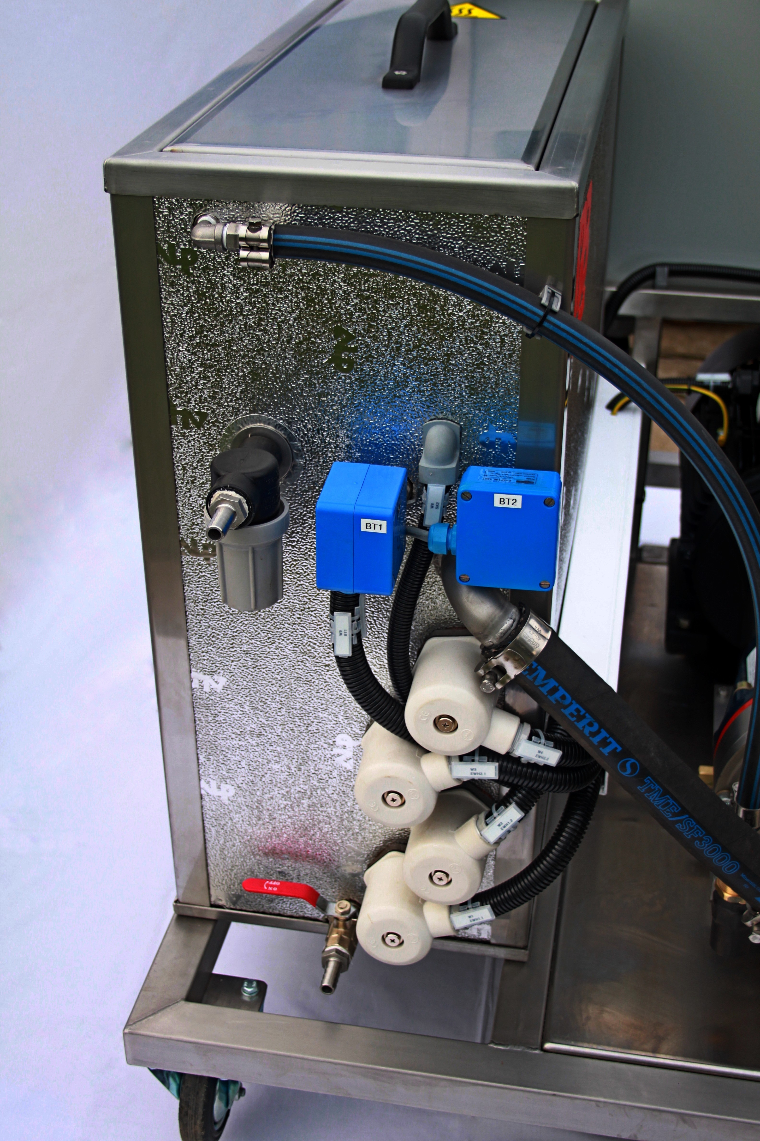Nerezová nádrž ohřevu je rozdělena přepážkou na dvě komory. V širší komoře je nerezový plovákový ventil dopouštění. Před plovákovým ventilem je osazen vstupní filtr s nerezovým sítem. Při práci s recyklovanou mycí lázní je nutné na nátok osadit jemný filtr (min. 80 µm). Pod plovákovým ventilem je naváděcí plech, který zajišťuje rovnoměrný nátok do užší komory, kde jsou umístěna čtyři nerezová topná tělesa o celkovém topném výkonu 30 kW. Nad topnými tělesy je snímač teploty a havarijní elektronický termostat. Z nádrže ohřevu je vyvedeno sání čerpadla. Chod čerpadla a topení je blokováno plovákovým spínačem minimální pracovní hladiny. Pro servis a údržbu je na nádrži vypouštěcí ventil ½“