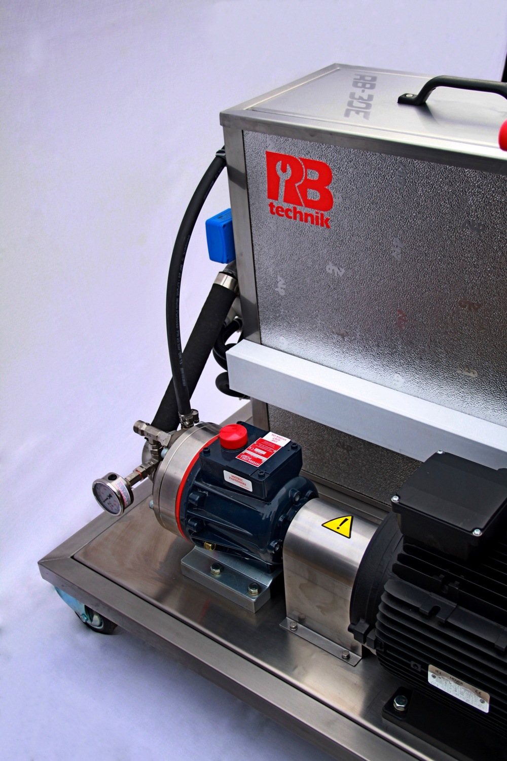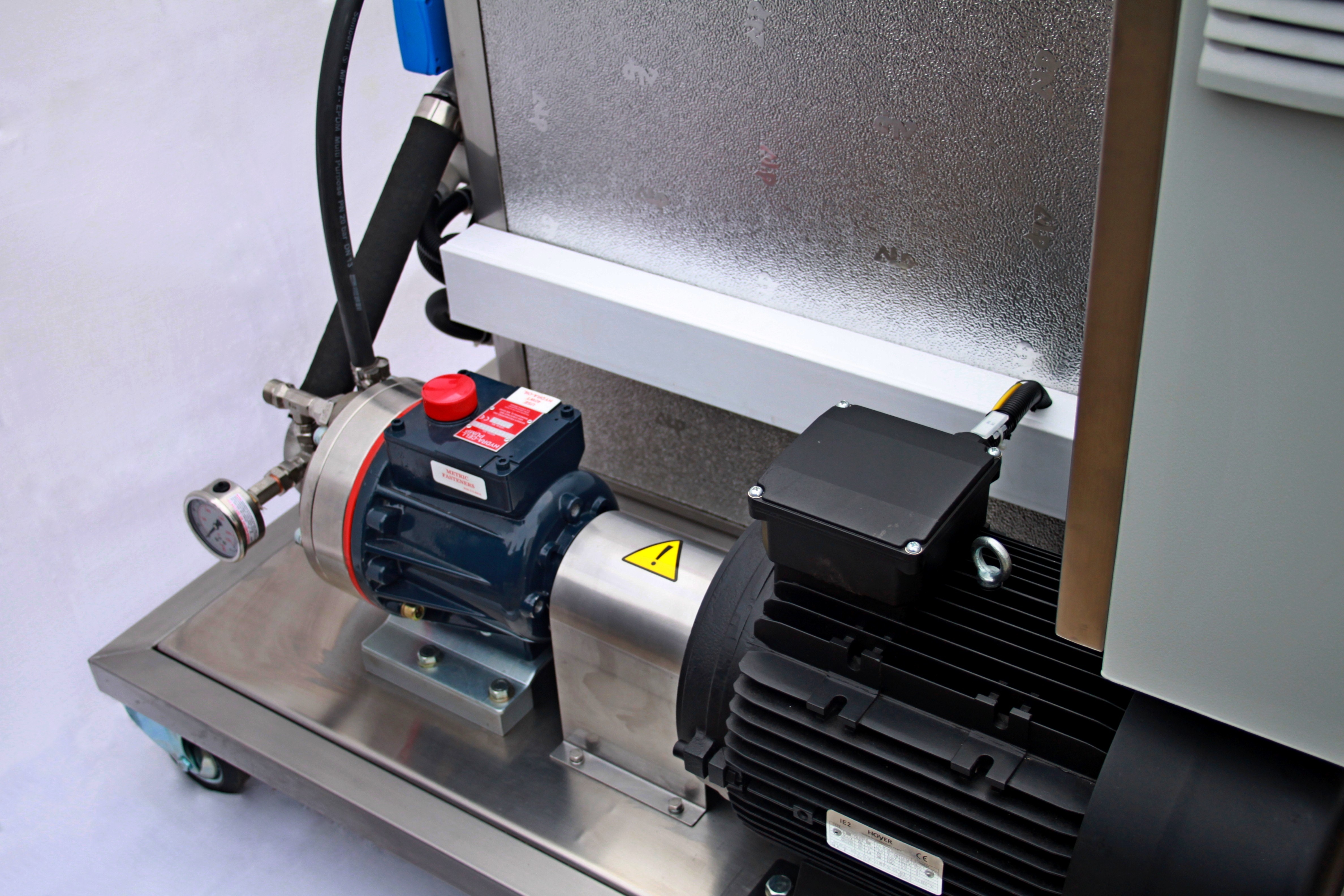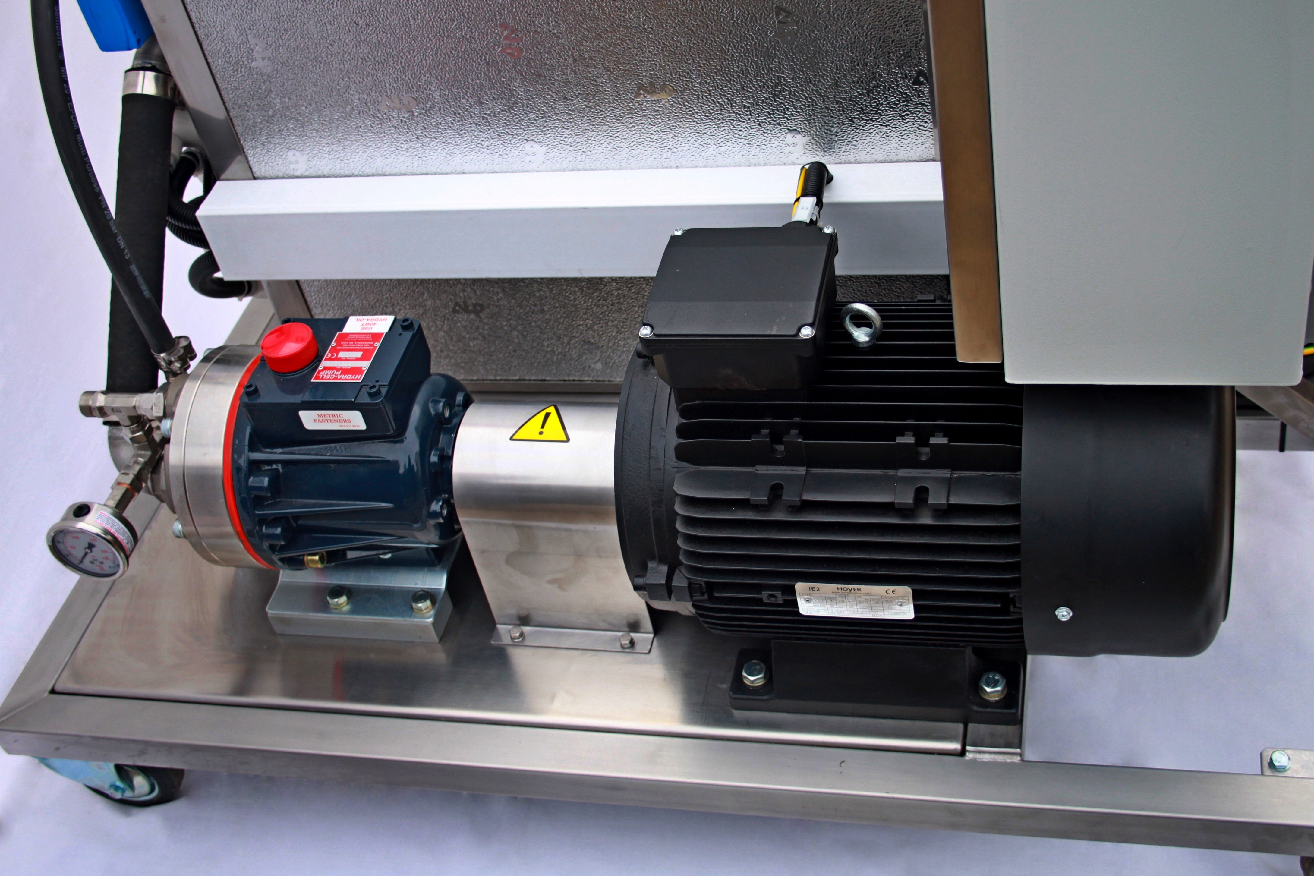 Vedle nádrže ohřevu je na rámu osazeno čerpadlo s elektromotorem. Čerpadlo je s nádrží propojeno sacím potrubím 1“. Výtlak čerpadla je osazen vysokotlakou hadicí a pistolí. Čerpadlo je chráněno proti přetlaku pojistným ventilem, který je nastaven na tlak 150-155 bar. Pokud by došlo ke zvýšení tlaku v systému (ucpáním trysky), ventil se otevře do obtoku. Obtok je zaveden hadicí zpět do nádrže ohřevu. Pro kontrolu pracovního tlaku je výtlak čerpadla osazen manometrem (0-160 bar).