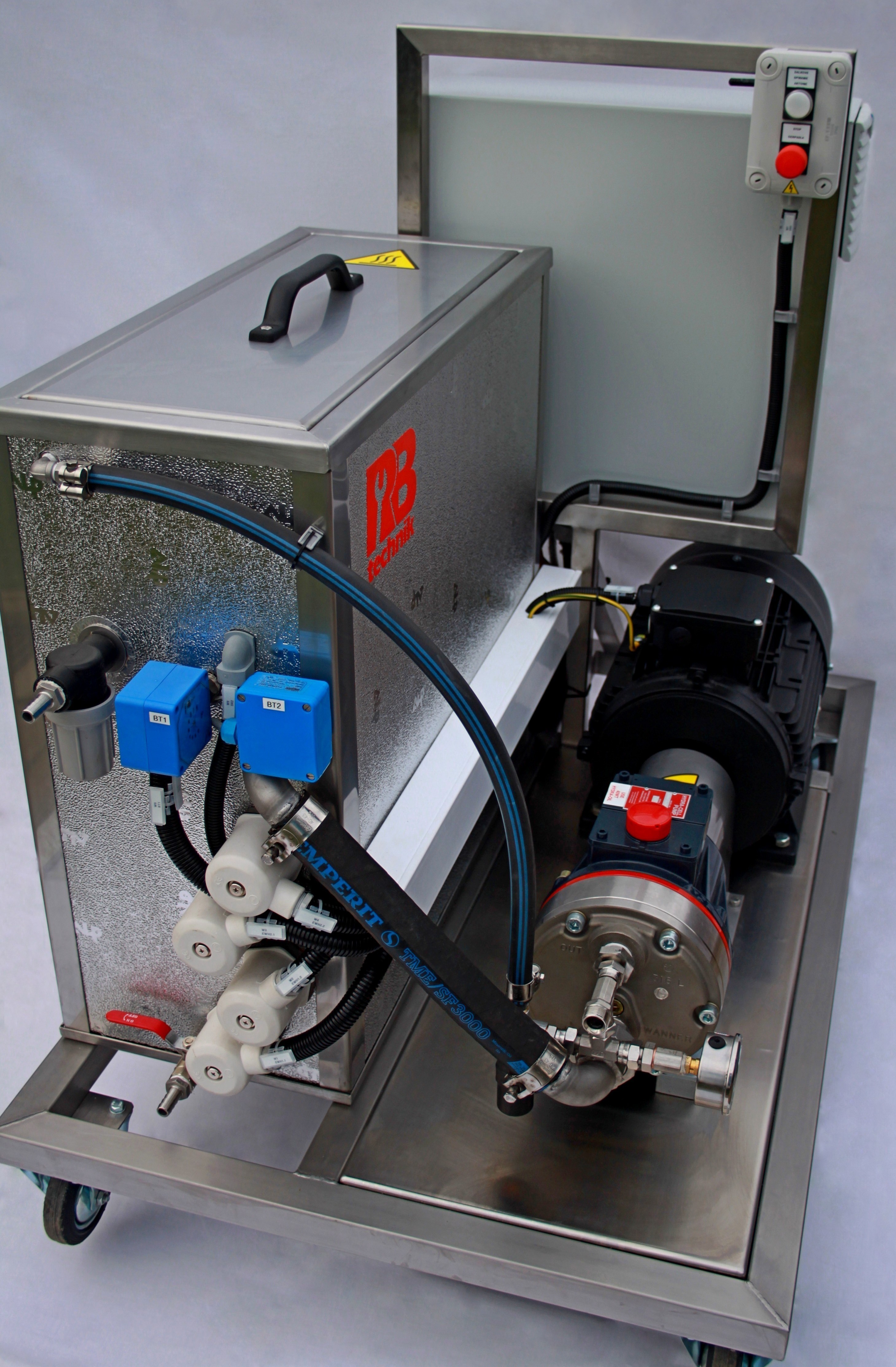 Mycí stroj se skládá z nerezové nádrže ohřevu o užitném objemu 85 litrů, čerpadla Interpump HT4715 s elektromotorem Nicolini (5,5 kW, 400V, 1450 rpm) a elektrického rozvaděče. Vše je uloženo na nerezovém rámu s pojezdovými koly. Pro lepší manipulaci jsou dvě kolečka otočná.